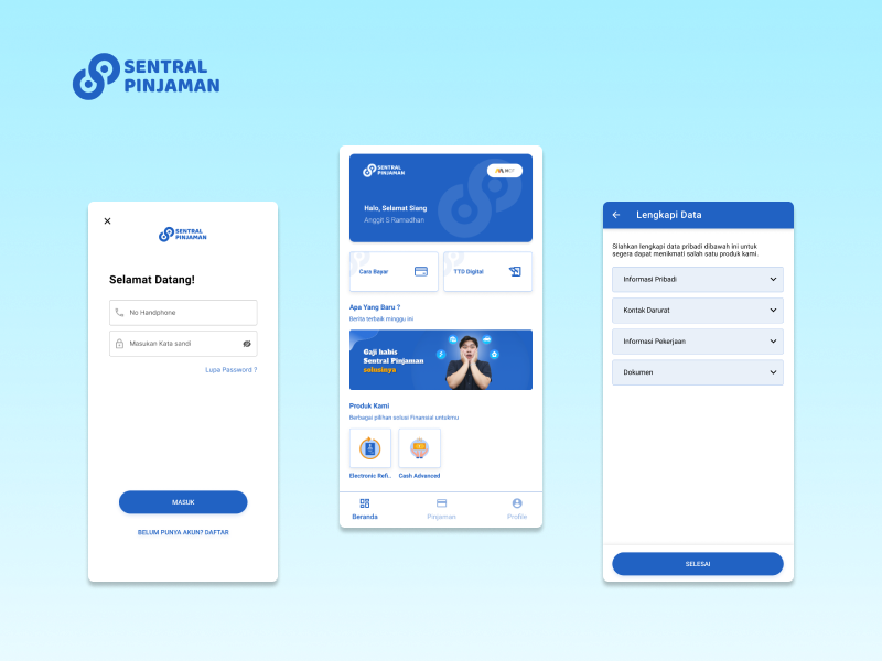 Aplikasi mobile produk finance Sentral Pinjaman yang digunakan untuk melayani segala jenis transaksi dan pengajuan pinjaman yang di provide oleh Sentral Pinjaman.